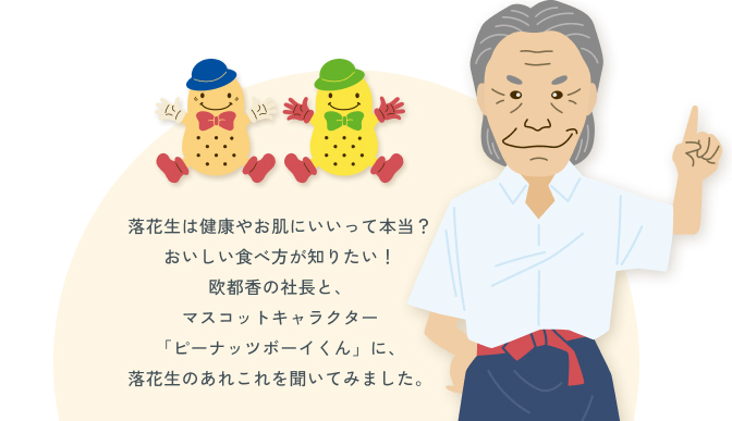 落花生は健康やお肌にいいって本当?おいしい食べ方が知りたい!欧都香社長と、マスコットキャラクター「ピーナッツボーイくん」に、落花生のあれこれを聞いてみました。